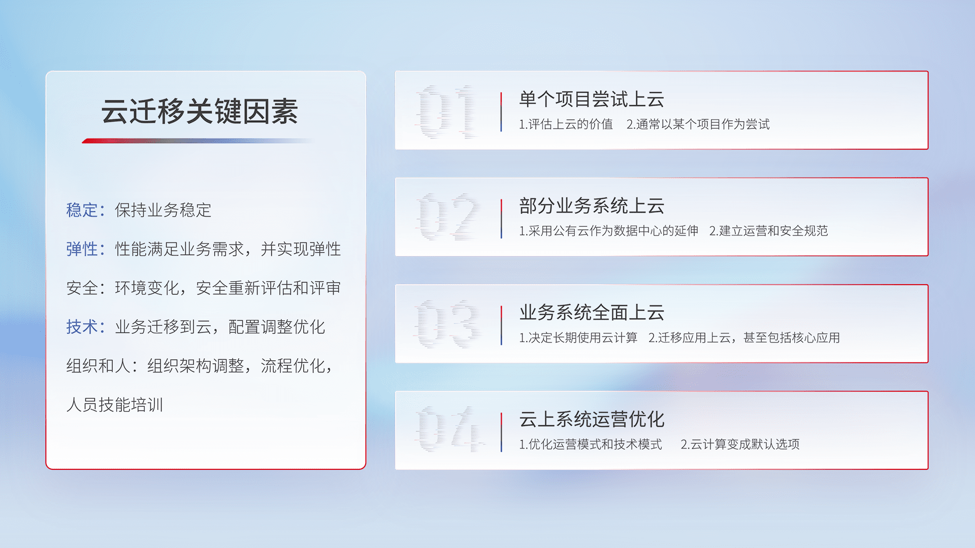 结合实际业务,,,,从规划设计、、、、云平台选型、、、云原生改造、、数据迁移、、集成交付,,,,迁移全过程为客户识别最佳上云路径,,,,做好风险识别管理,,,,设计网络架构、、、身份权限、、安全审计合规、、、、操作审计、、、、日志审计、、、、监控告警策略、、、多站点容灾设计等,,,对云上基础设施进行整体规划,,,提升IT治理水平,,,,以满足弹性、、、、高可用、、高性能的需求。。